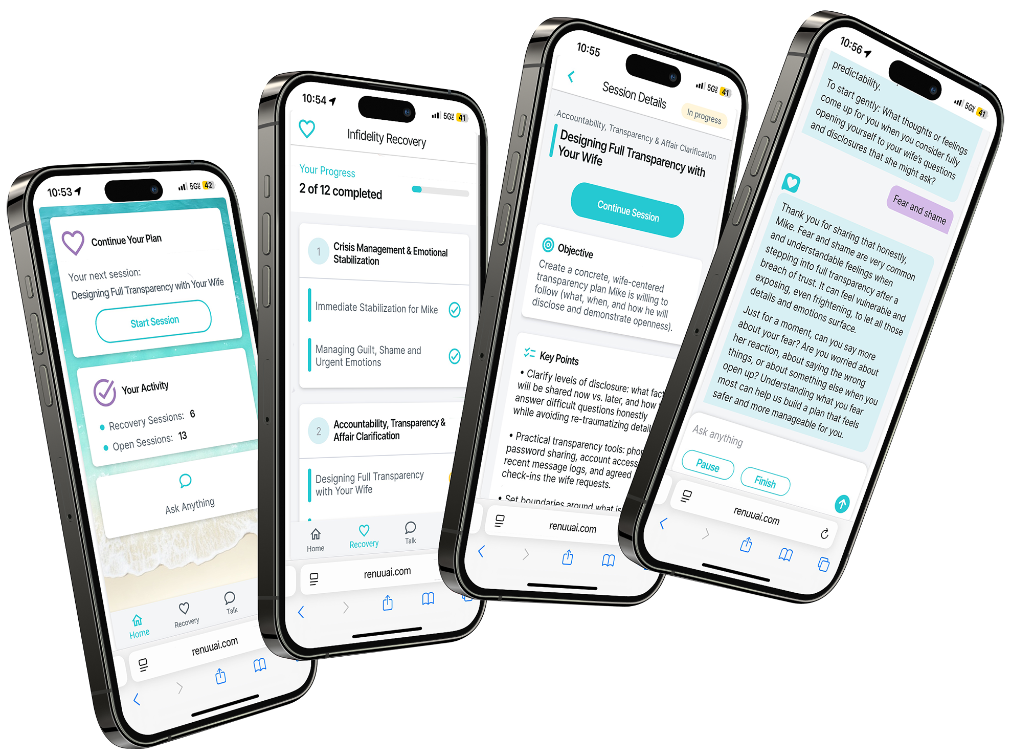 A mobile friendly AI coach dedicated to helping you move forward after betrayal and infidelity. Maybe you’ve been hurt, made a mistake, or hope to rebuild together with your partner—RenuuAI offers a private, judgment-free space to rebuild trust and regain clarity.